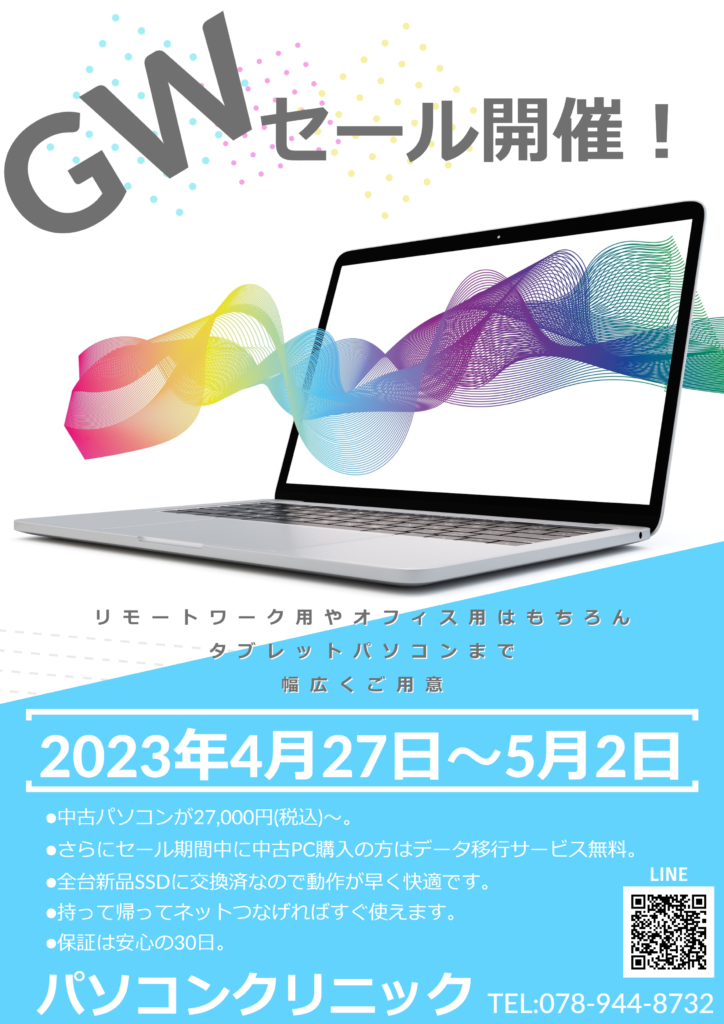 2023年4月27日~5月2日までGWセールを開催します! 期間中、中古ノートパソコンご購入の方には「データ移行サービス」を無料でさせていただきます。 また、新品SSDに交換済なので動作も快適となっております。 -